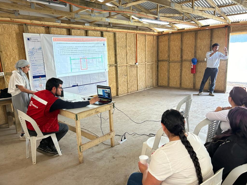 A través de imágenes se muestra el estado de las obras que avanzan con normalidad. Luego, se presentan las respuestas a consultas planteadas por dirigentes y familias durante la visita a la vivienda piloto y otras dudas que surgen durante la reunión.