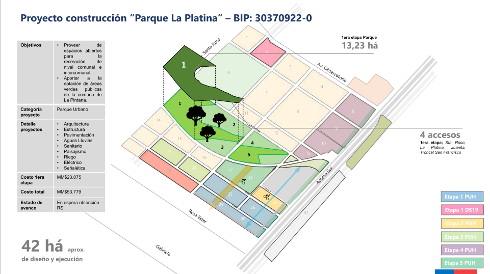 Otro objetivo central de este Plan, es el Parque La Platina el cual será administrado por PARQUEMET. Con 5 etapas, será uno de los mas grandes pulmones verdes de nuestra ciudad, un parque a escala intercomunal. La primera etapa será licitada a fines de año para su posterior construcción durante el año 2024.