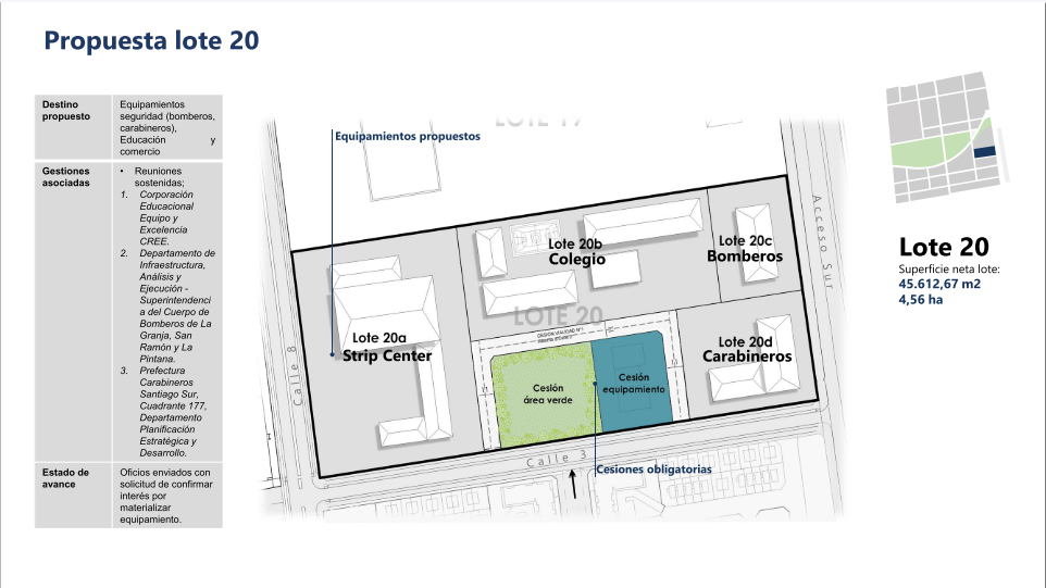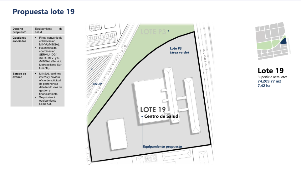 Asimismo, SERVIU Metropolitano presentó los Equipamientos con que contará el PUH. Estos estarán ubicados en dos Lotes con más de 11 há. en el centro oriente de La Platina, destinados a la construcción de un Centro de Salud de escala Mayor, Educación, seguridad a través de Carabineros, Bomberos y Comercio.