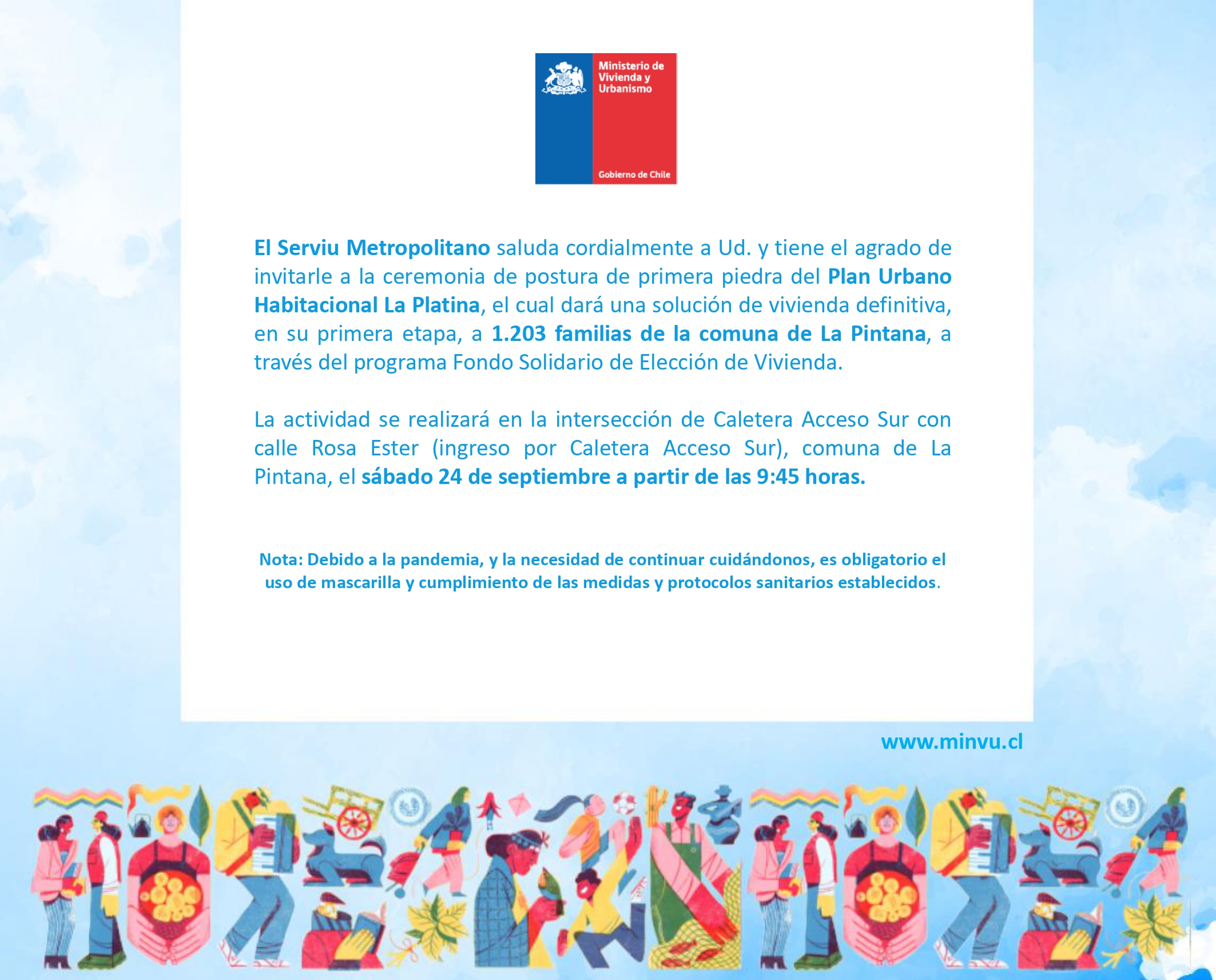 Este sábado 24 de Septiembre nos encontramos en esta esperada ceremonia de Primera Piedra del futuro Ecobarrio La Platina 1. Les esperamos a contar de las 09:00 hrs en las inmediaciones del terreno.